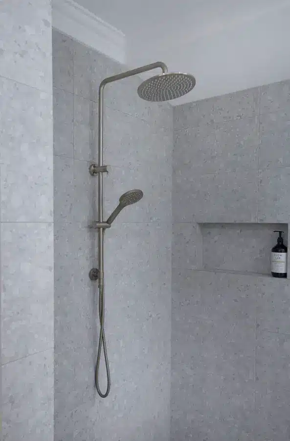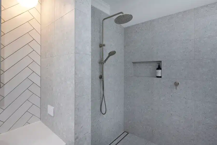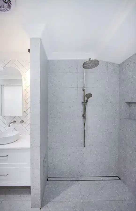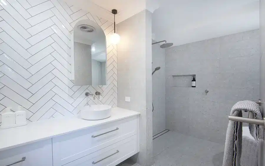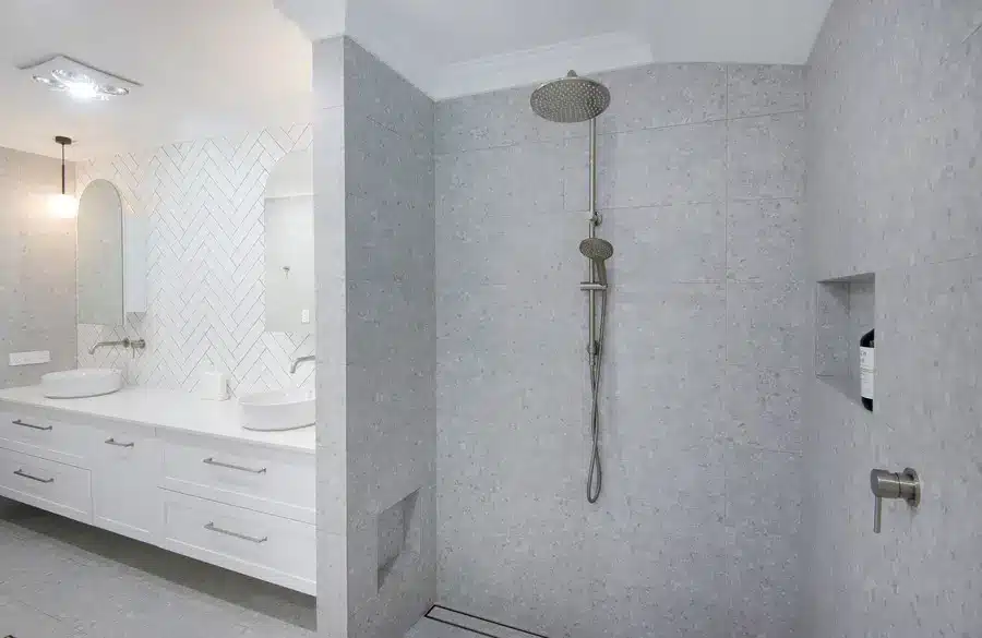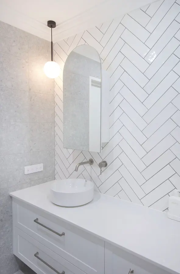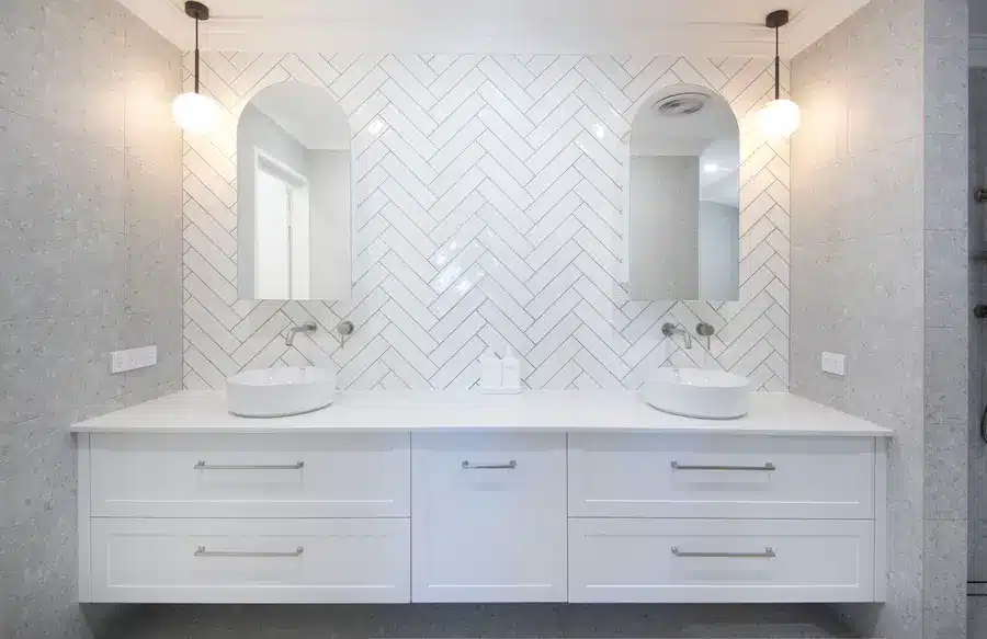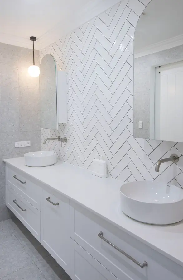 This Aubin Grove bathroom balances everyday function with calm, timeless style. A generous walk-in shower sits behind a tiled privacy wall, finished with a rainfall head, hand shower and a neat recessed niche. Large-format grey stone-look tiles wrap the floor and walls for a seamless, low-maintenance finish. At the vanity, a white herringbone feature splashback, twin arched mirrors and wall-mounted mixers create a crisp focal point. The double shaker-style vanity delivers real storage without visual clutter. Soft, even lighting and simple brushed-nickel hardware complete a space that feels fresh, ordered and easy to live with.