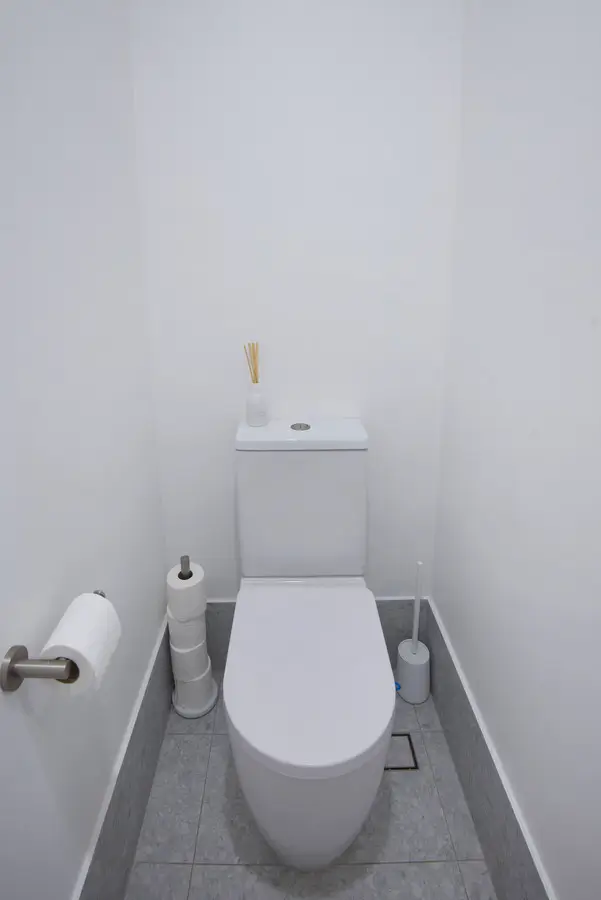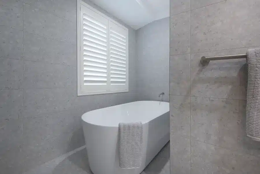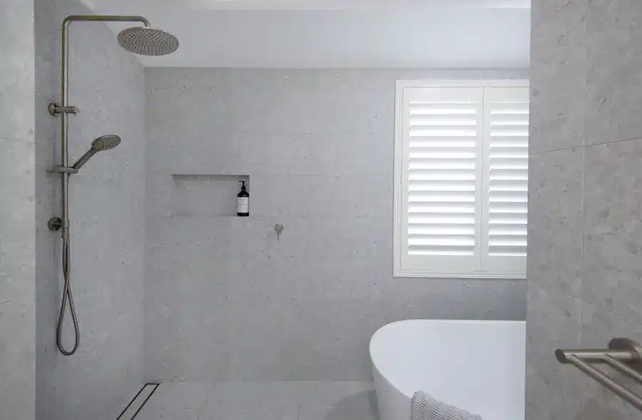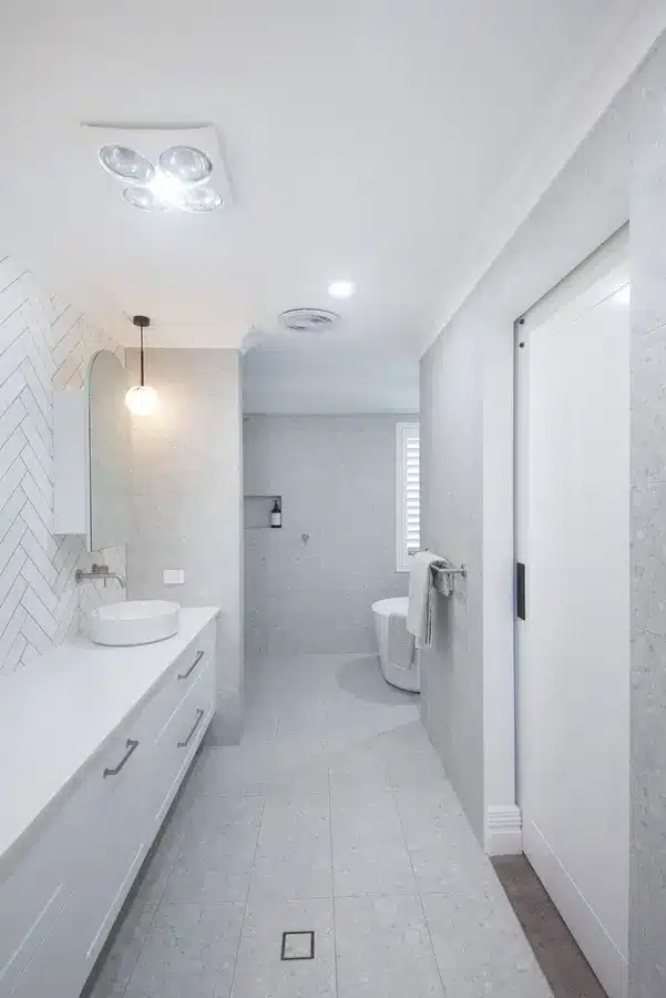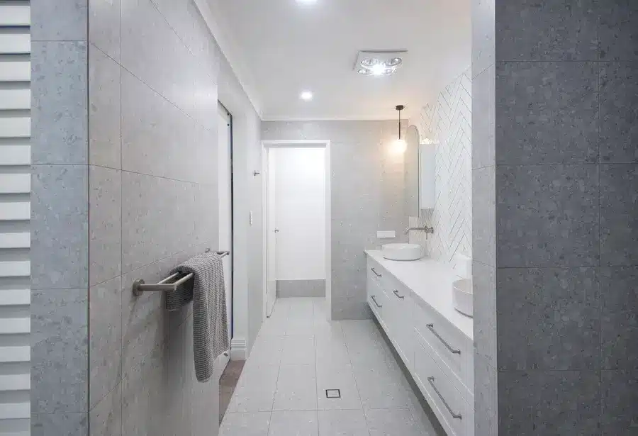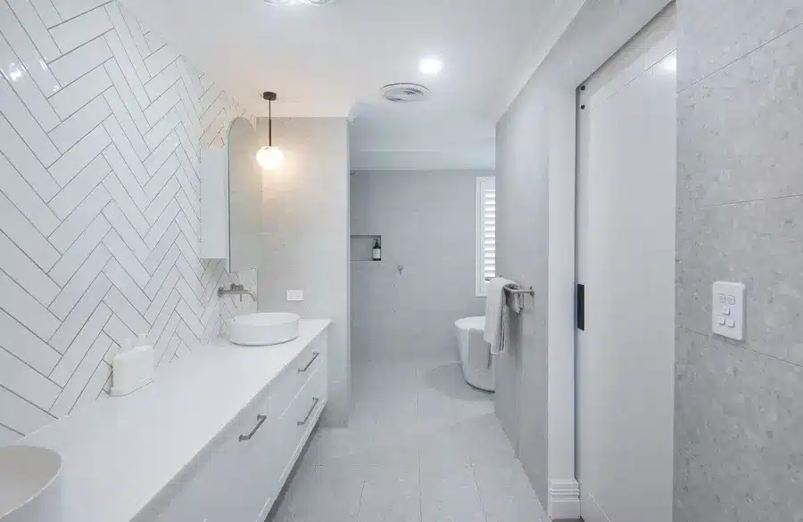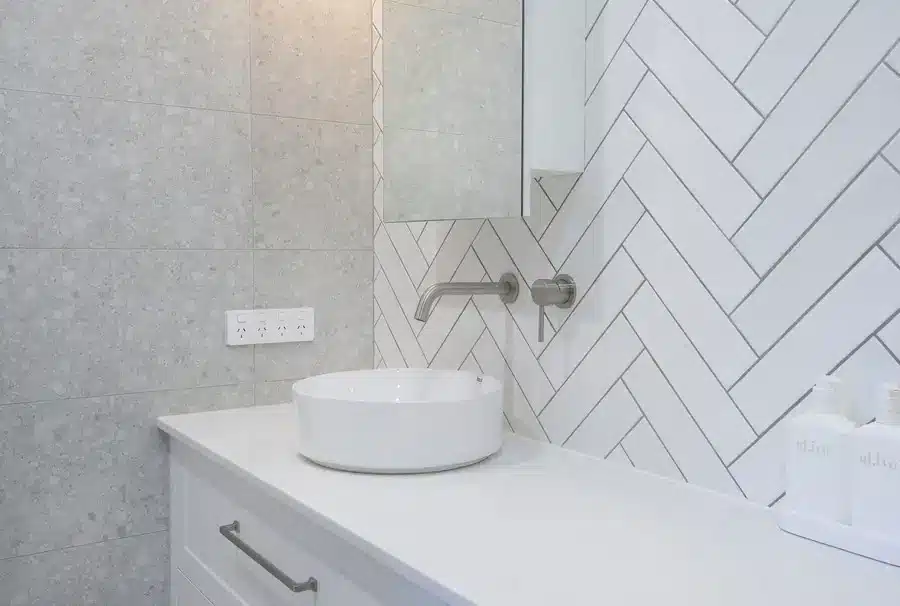 This Aubin Grove bathroom balances everyday function with calm, timeless style. A generous walk-in shower sits behind a tiled privacy wall, finished with a rainfall head, hand shower and a neat recessed niche. Large-format grey stone-look tiles wrap the floor and walls for a seamless, low-maintenance finish. At the vanity, a white herringbone feature splashback, twin arched mirrors and wall-mounted mixers create a crisp focal point. The double shaker-style vanity delivers real storage without visual clutter. Soft, even lighting and simple brushed-nickel hardware complete a space that feels fresh, ordered and easy to live with.