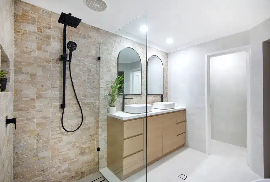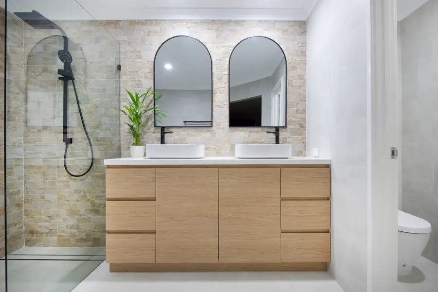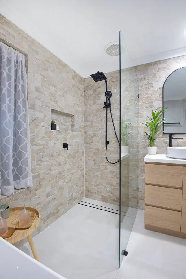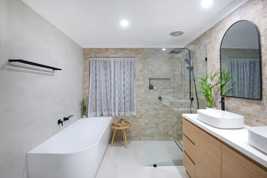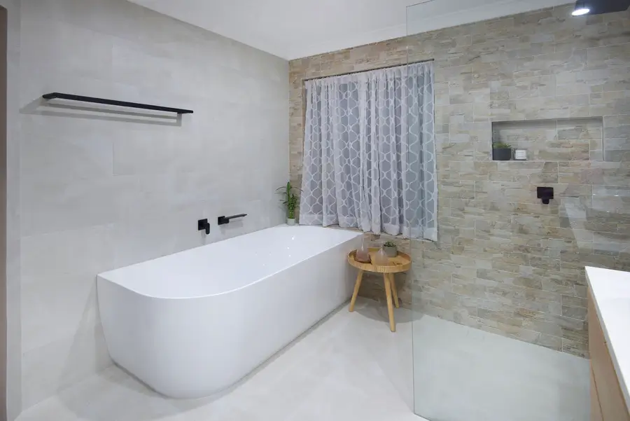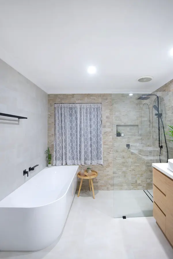 This Rockingham bathroom blends coastal warmth with clean, modern lines. Textured stone feature walls wrap the vanity and shower, adding depth and a soft, beach-toned palette. A frameless walk-in shower with rain and hand shower sits on a linear drain, with a recessed niche keeping bottles tidy. The floating timber vanity and slim white benchtop support twin vessel basins, paired with arched black-framed mirrors for a gentle, contemporary curve. A freestanding bath rests under the window with simple privacy curtains. Matte black tapware, pale seamless flooring and fresh greenery complete a calm, spa-like space.