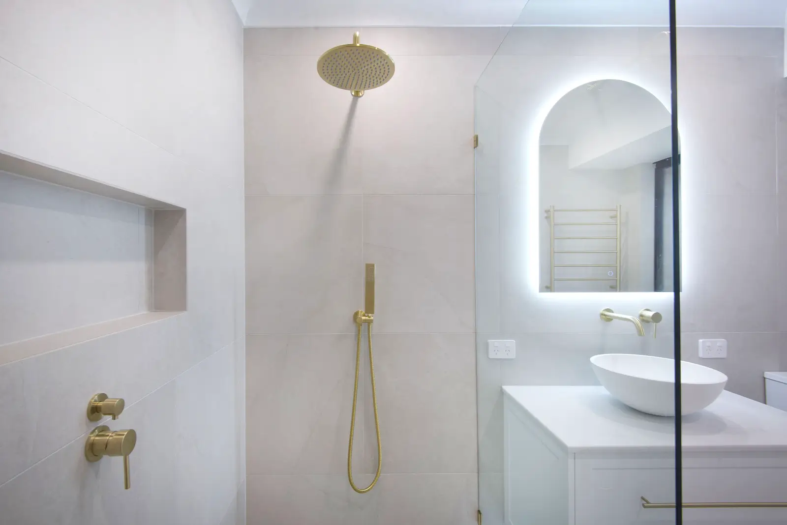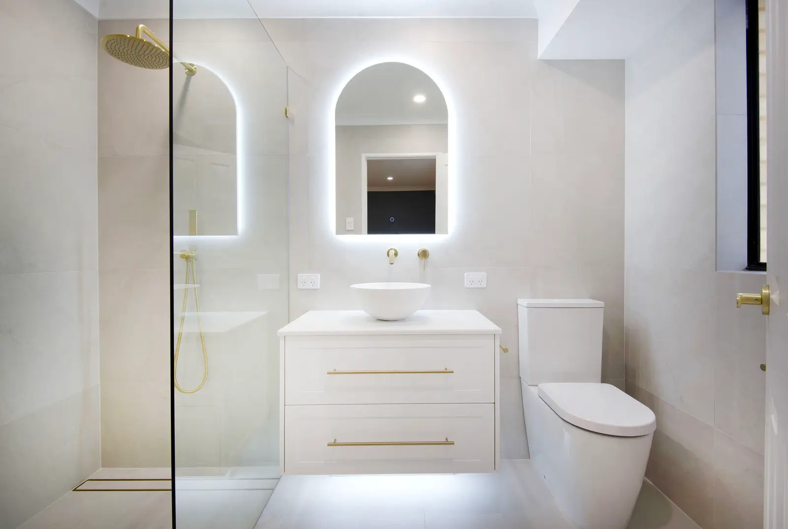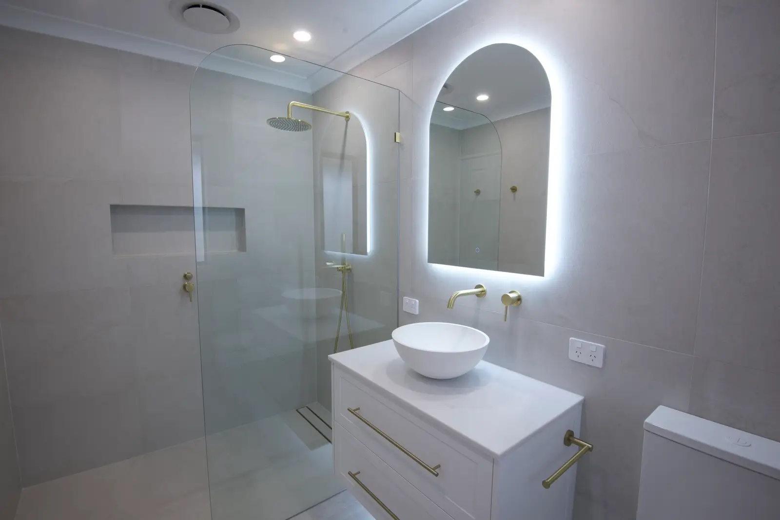 This Baldivis bathroom keeps lines clean and the palette quiet, then lifts it with soft gold details. Large-format light grey tiles wrap the room for a seamless look that is easy to keep clean. A frameless walk-in shower with gently curved glass, rain head and handheld sits over a linear drain, with a recessed niche to keep bottles off the floor. At the vanity, an arched backlit mirror and round vessel basin create a simple focal point. The white shaker drawers with long gold pulls tie the scheme together for a bright, spa-like space.