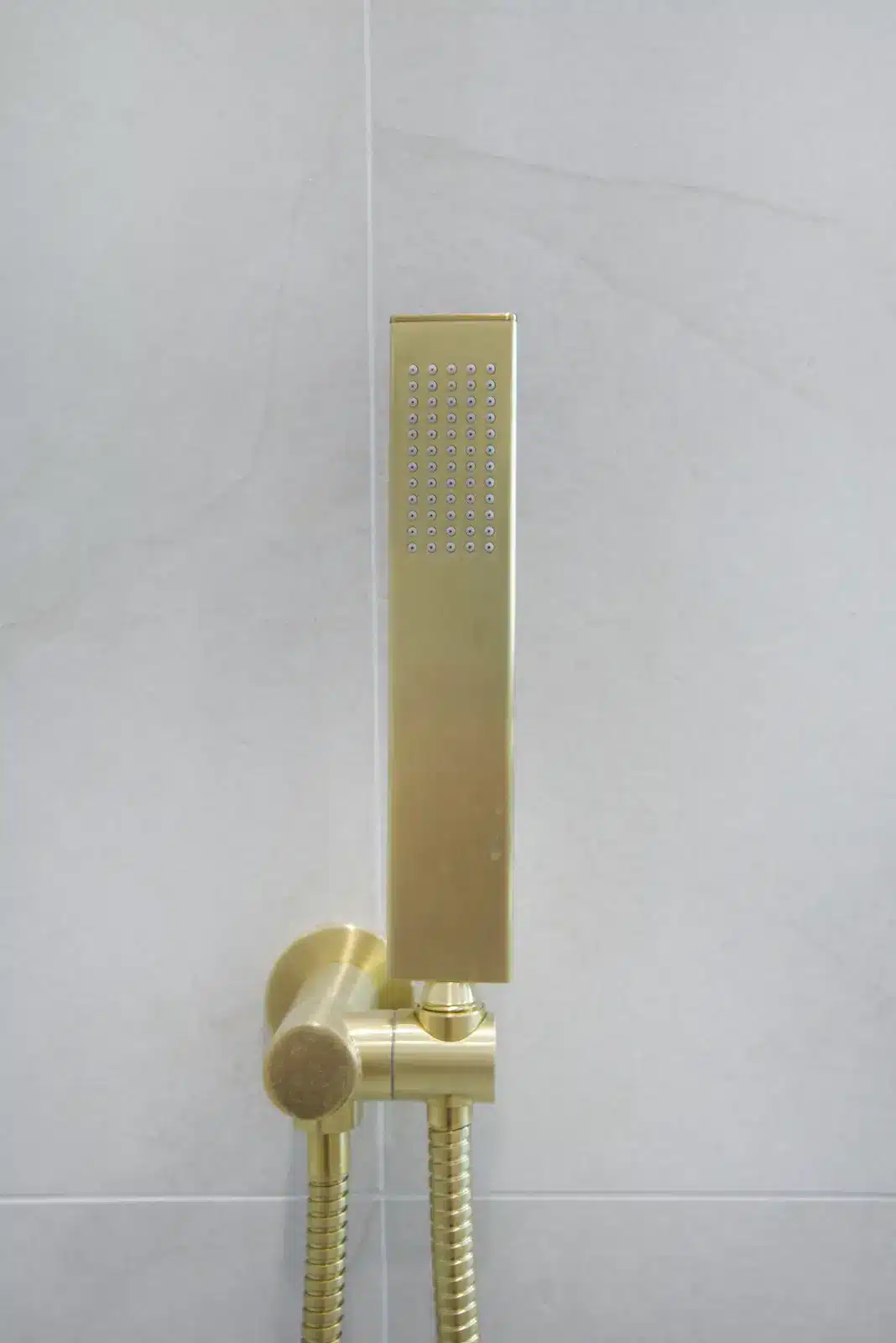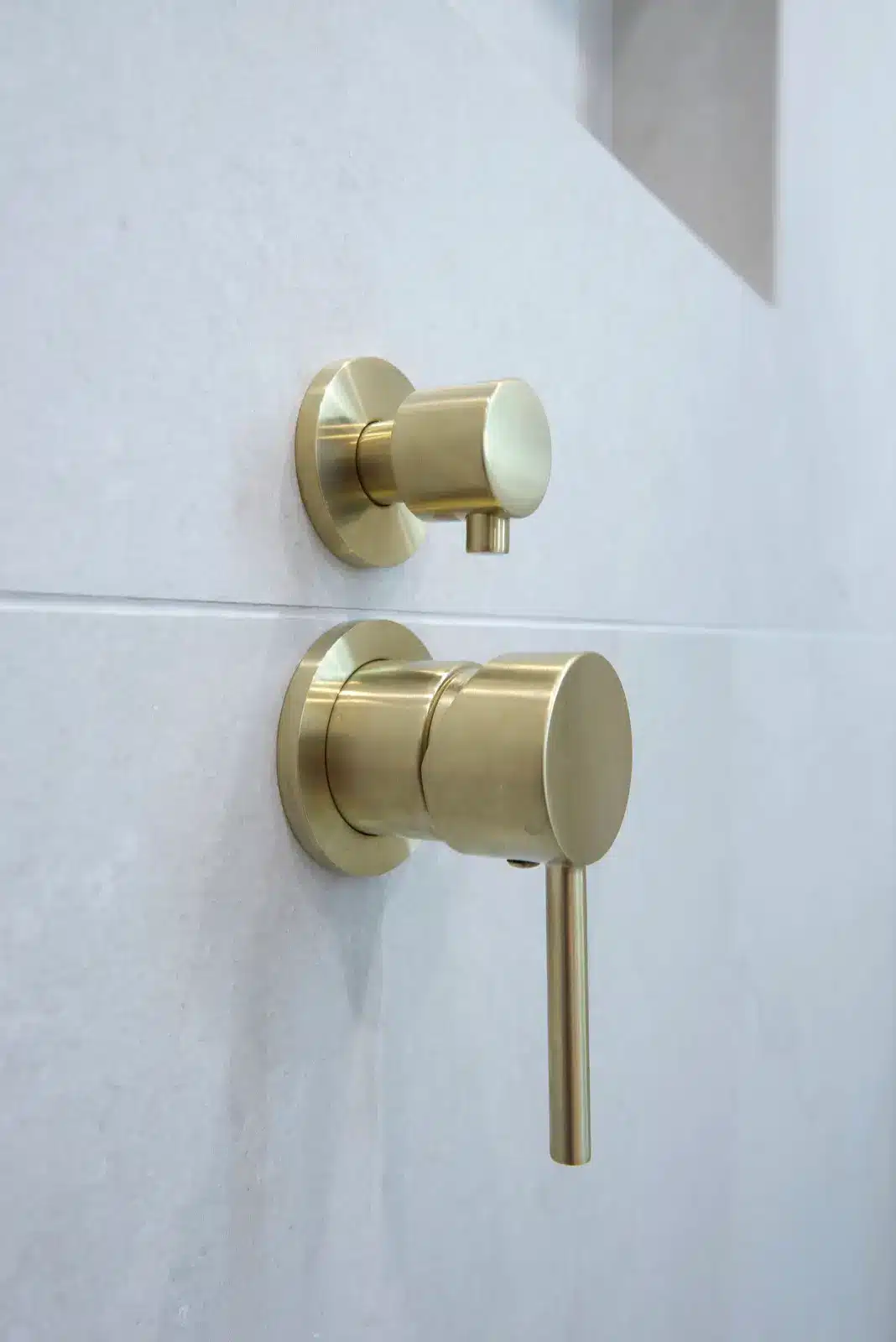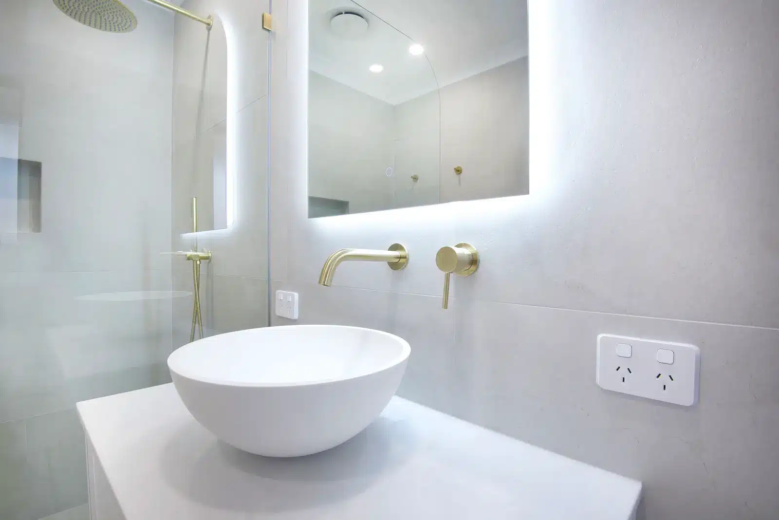 This Baldivis bathroom keeps lines clean and the palette quiet, then lifts it with soft gold details. Large-format light grey tiles wrap the room for a seamless look that is easy to keep clean. A frameless walk-in shower with gently curved glass, rain head and handheld sits over a linear drain, with a recessed niche to keep bottles off the floor. At the vanity, an arched backlit mirror and round vessel basin create a simple focal point. The white shaker drawers with long gold pulls tie the scheme together for a bright, spa-like space.