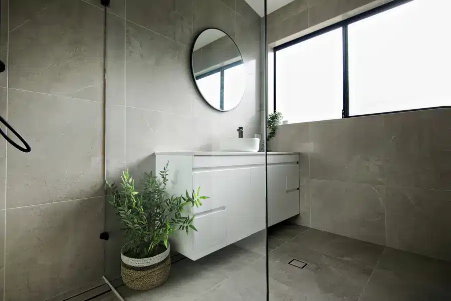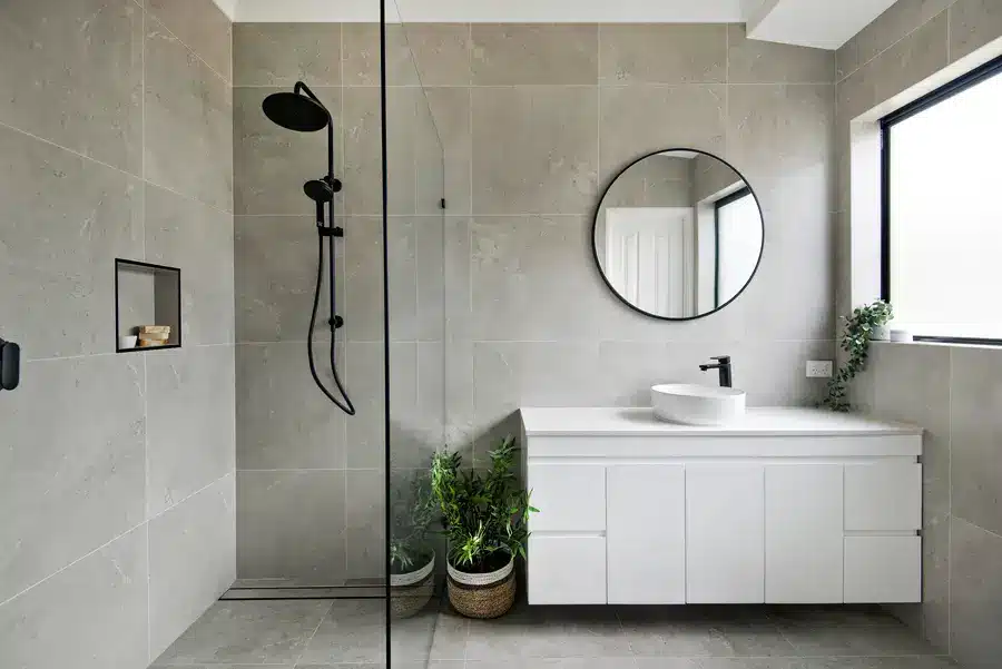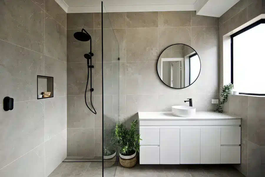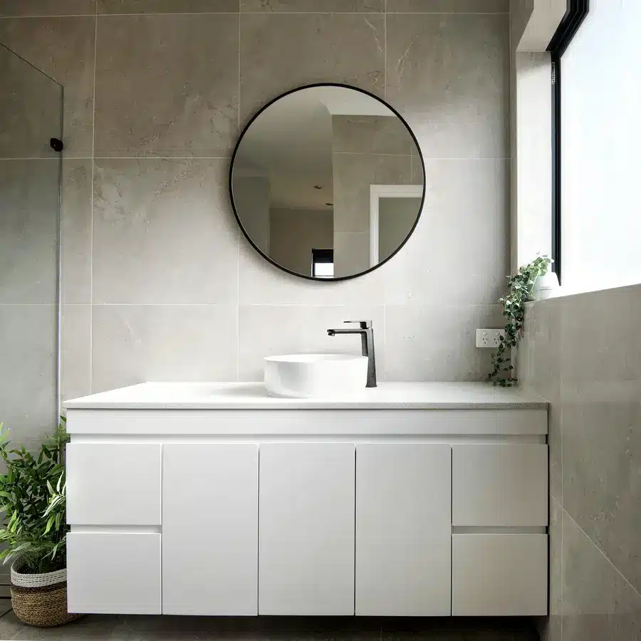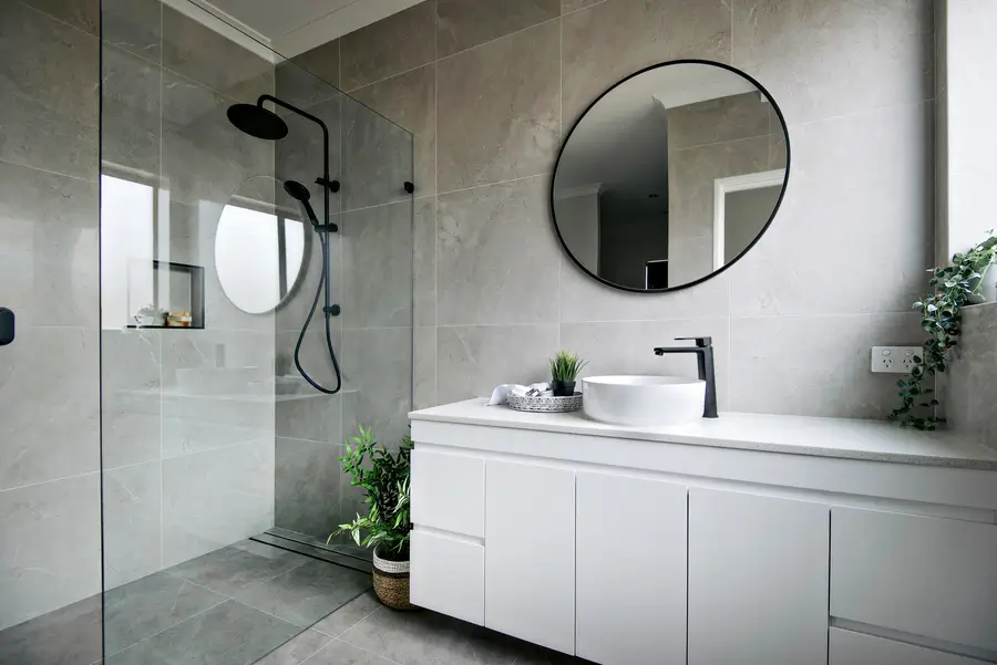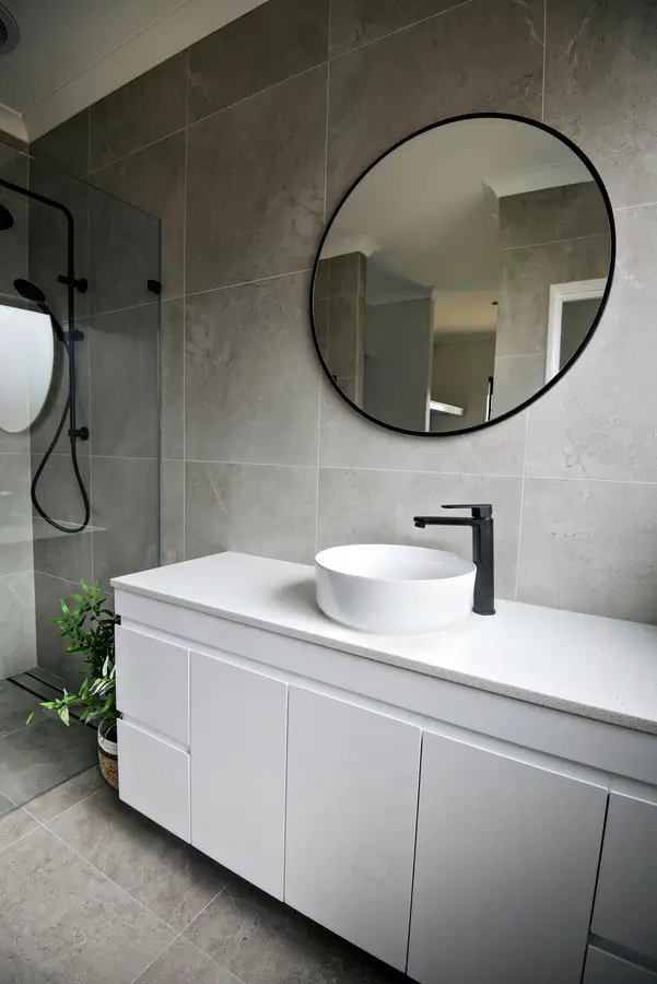 This Baldivis bathroom is calm, modern and easy to live with. Large-format stone-grey tiles wrap the walls and floor for a seamless look that’s simple to maintain. A frameless walk-in shower features a rainfall head and handheld in matte black, with a recessed niche and linear drain to keep the floor clear. The floating white vanity keeps lines clean and offers real storage, topped with a slim light benchtop and a round vessel basin. An oversized round mirror softens the geometry, while a touch of greenery adds warmth to the monochrome palette.