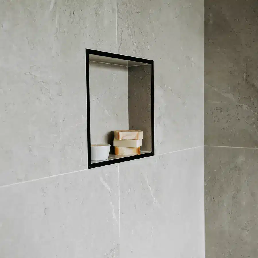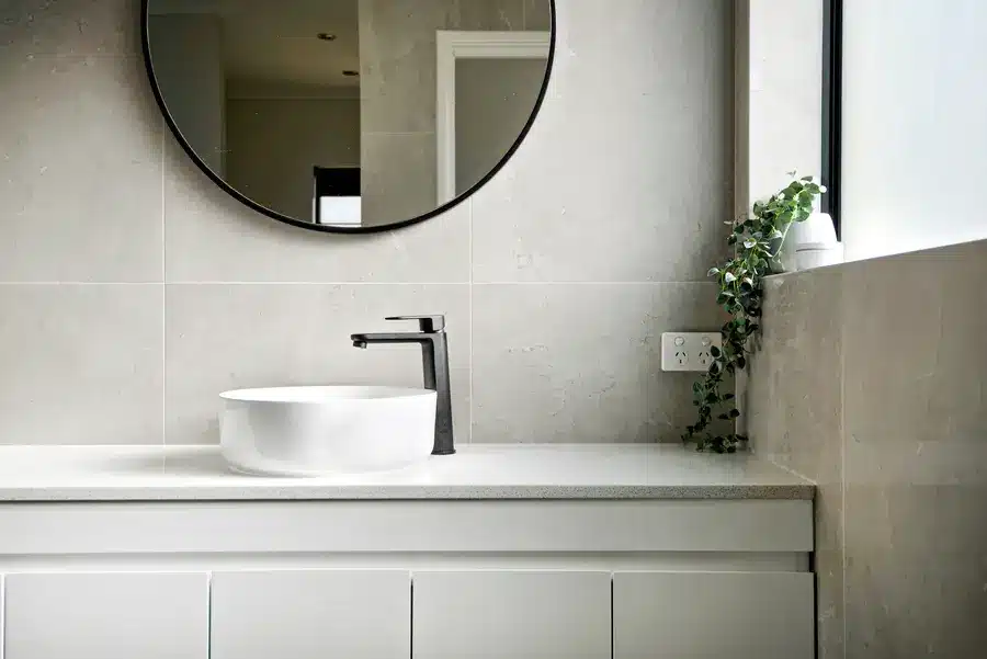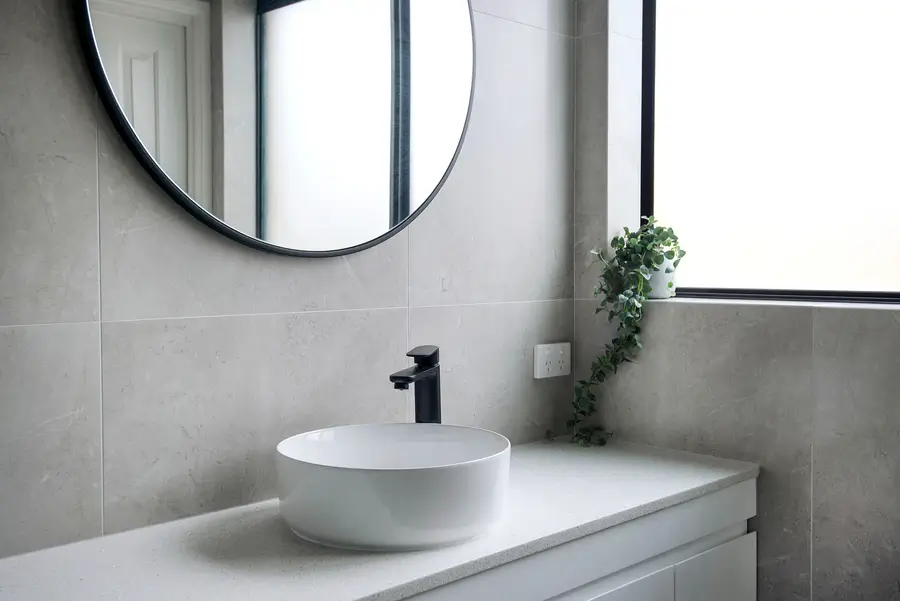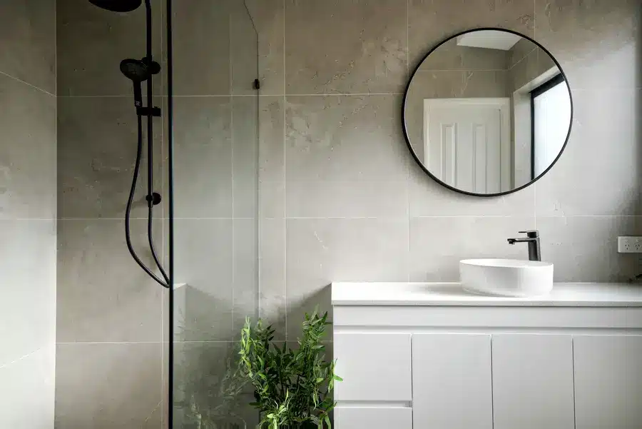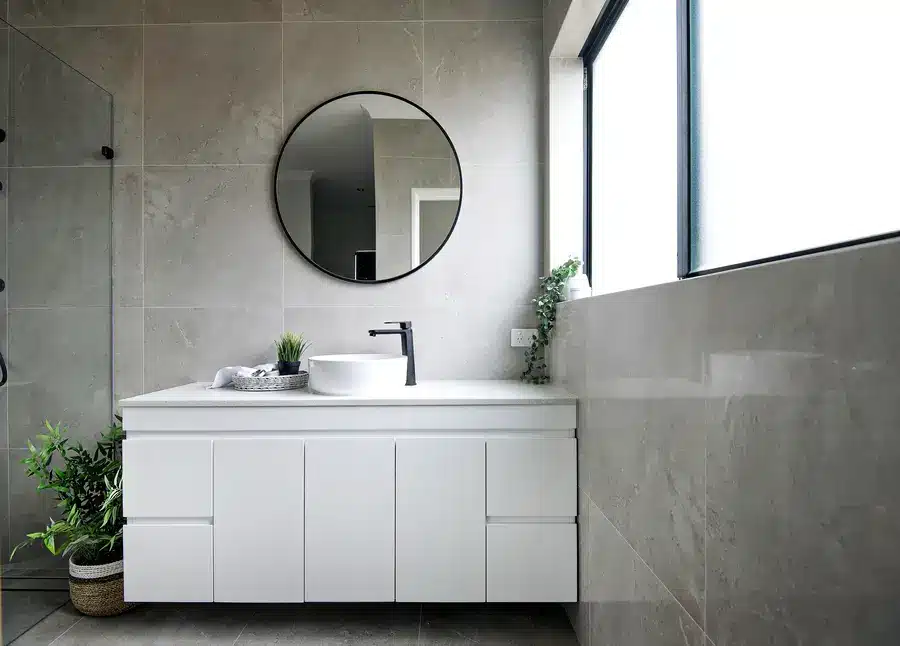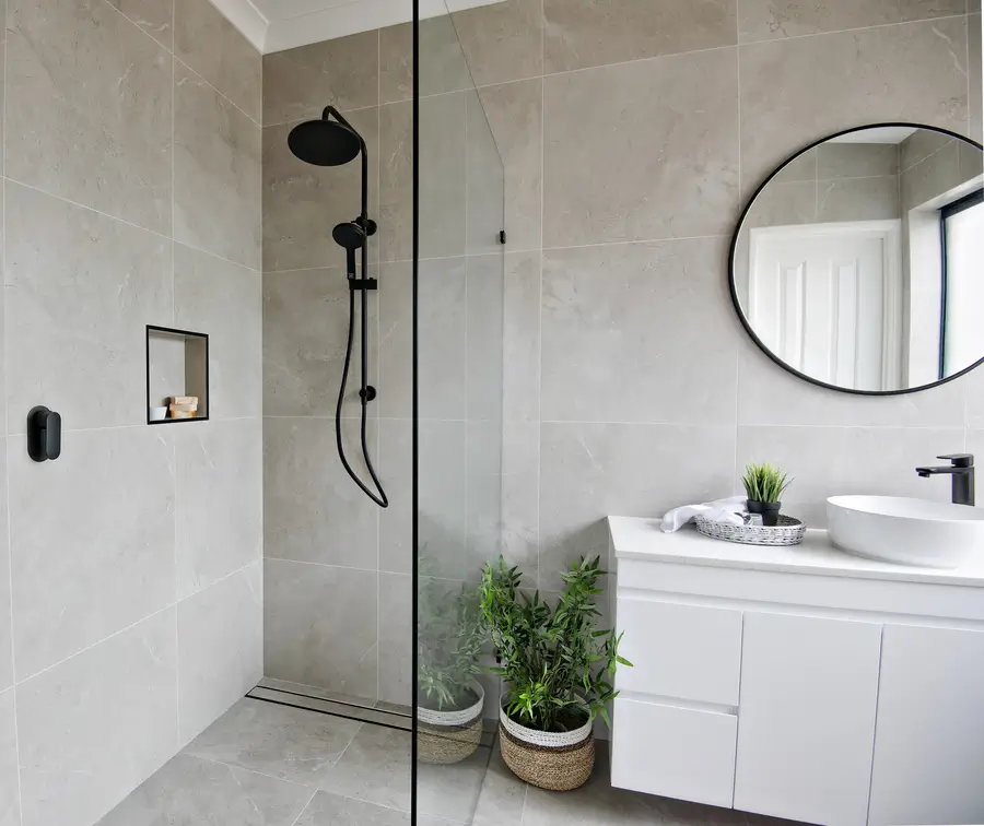 This Baldivis bathroom is calm, modern and easy to live with. Large-format stone-grey tiles wrap the walls and floor for a seamless look that’s simple to maintain. A frameless walk-in shower features a rainfall head and handheld in matte black, with a recessed niche and linear drain to keep the floor clear. The floating white vanity keeps lines clean and offers real storage, topped with a slim light benchtop and a round vessel basin. An oversized round mirror softens the geometry, while a touch of greenery adds warmth to the monochrome palette.