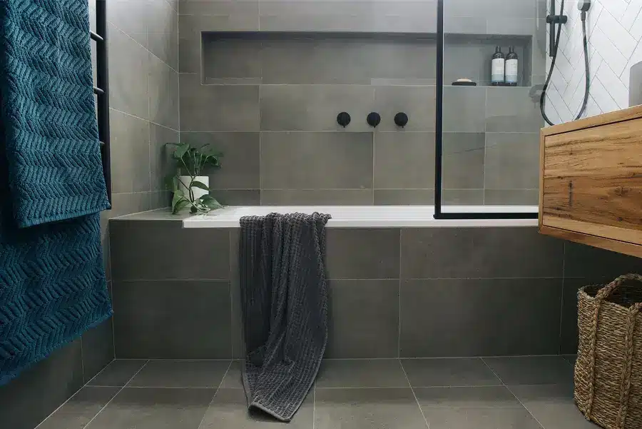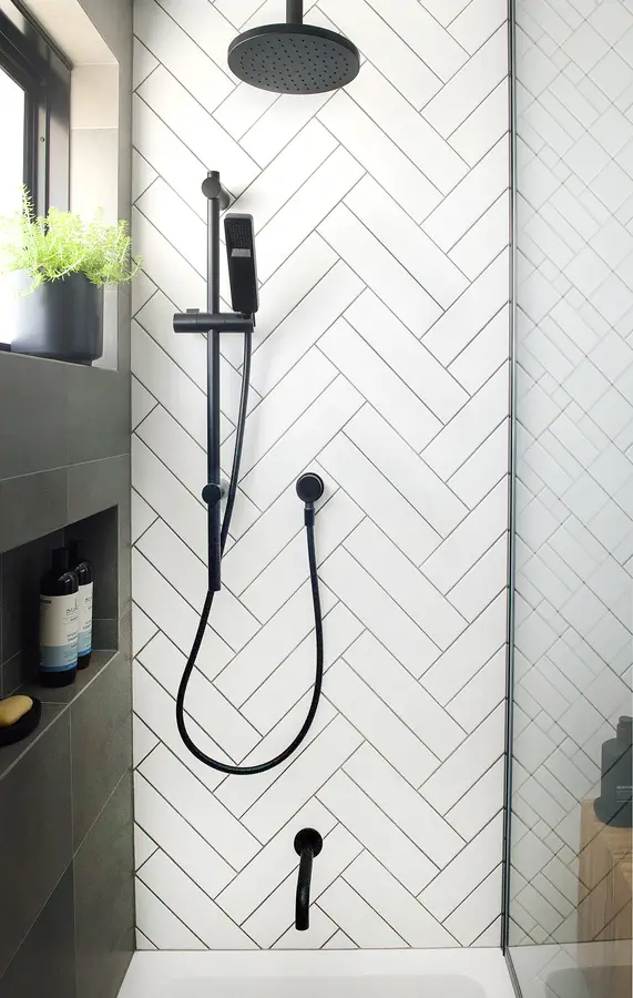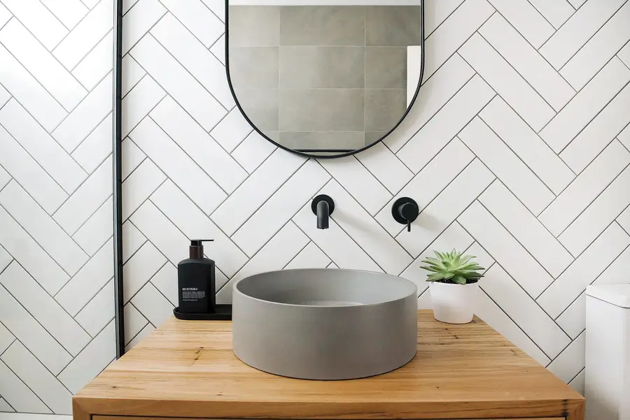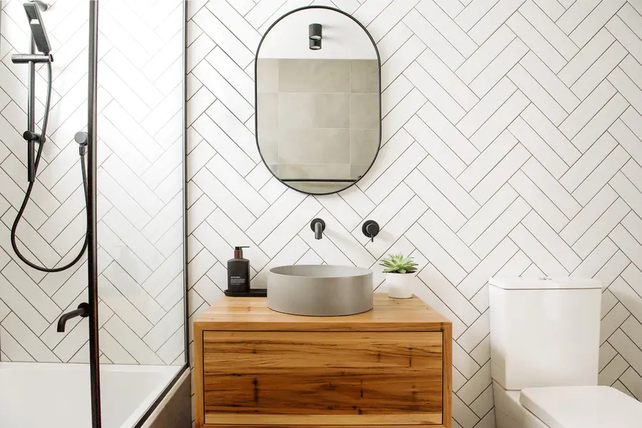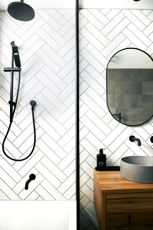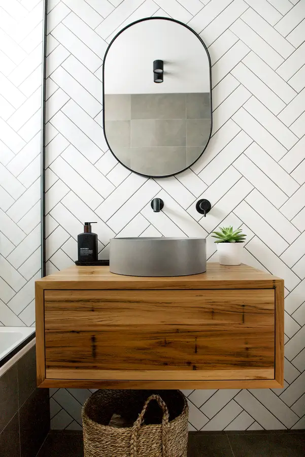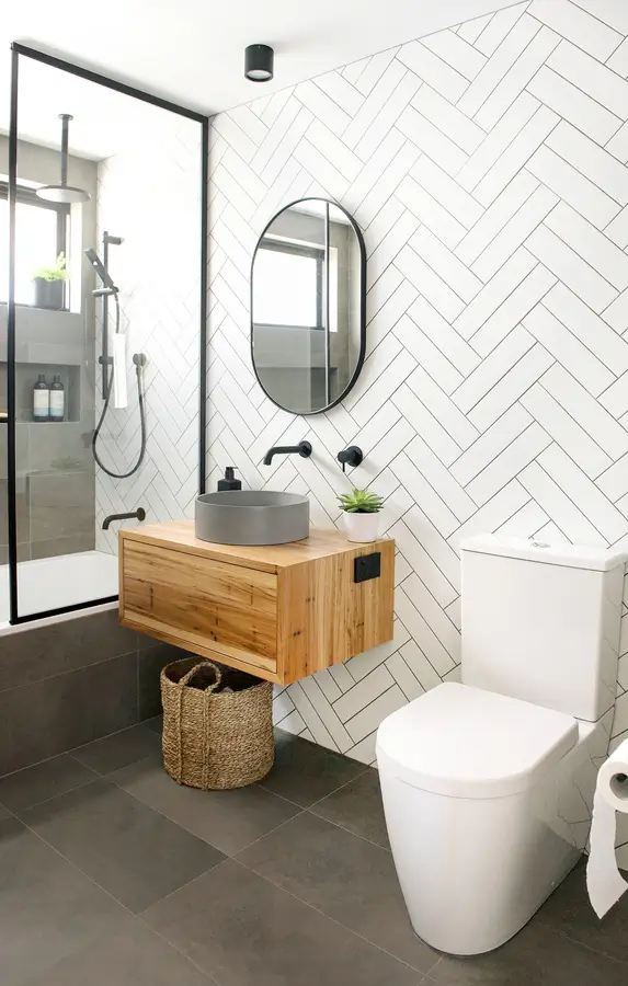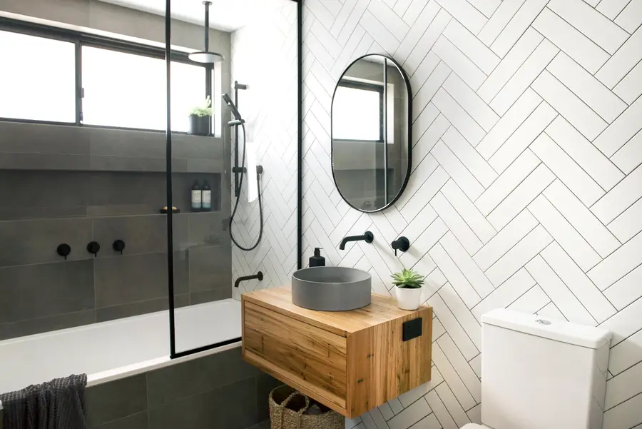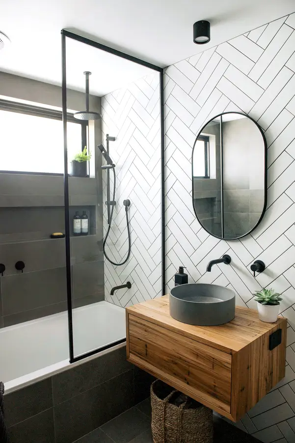 This Spearwood bathroom mixes crisp monochrome detailing with a warm, natural touch. A combined bath–shower sits behind a slim black-framed glass screen, fitted with a rain head and handheld in matte black. Large charcoal tiles ground the wet zone while a full herringbone wall in white creates a bright focal backdrop. The floating timber vanity adds softness and everyday storage, topped with a slim benchtop and a circular concrete-look basin. An oval black-edged mirror and simple black mixers keep lines clean. The result is a compact, easy-care space that feels modern, tidy and inviting.